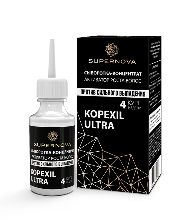 Kopexil Ultra (Diaminopyrimidine Oxide) активизирует ростовую фазу волоса (анаген). Препятствует затвердению коллагена и разрастанию соединительной ткани, что дает волосам возможность активно расти. Сыворотка стимулирует переход волосяных фолликул из фазы покоя (телоген) в фазу роста (анаген). Улучшает кровообращение, возвращает жизнеспособность волосяной луковице, усиливает фиксацию волоса в коже головы, останавливает потерю волос.