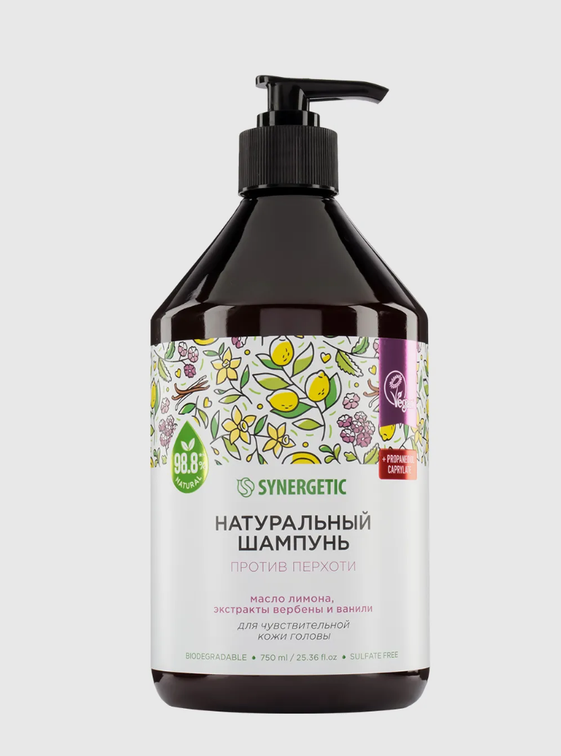 Бессульфатный шампунь Synergetic нормализует работу сальных желез, уменьшает распространение грибка рода Malassezia и успокаивает чувствительную кожу головы — благодаря пропандиол каприлату в составе. Масло лимона и экстракт вербены укрепляют структуру, способствуют росту локонов, облегчают расчесывание, возвращают гладкость и шелковистость. Экстракт ванили интенсивно питает и увлажняет, а бисаболол — придает мягкость. Подходит для всех типов волос, склонных к перхоти. Сертифицирован британской организацией The Vegan Society. Большой объем 750 мл — хватит надолго.