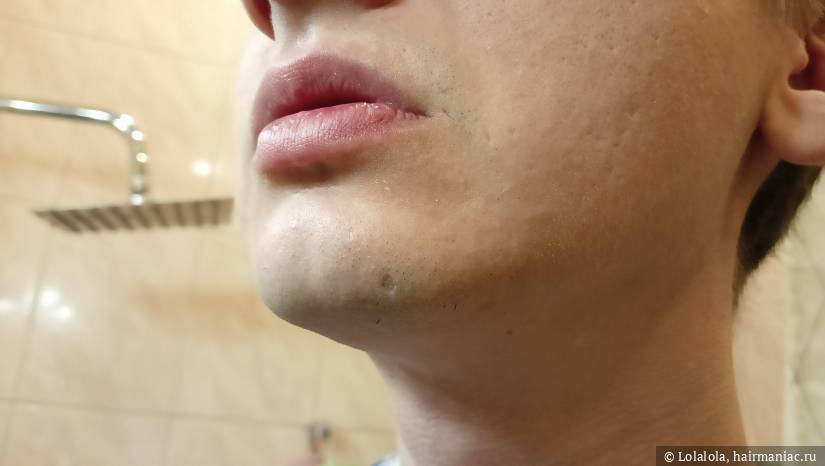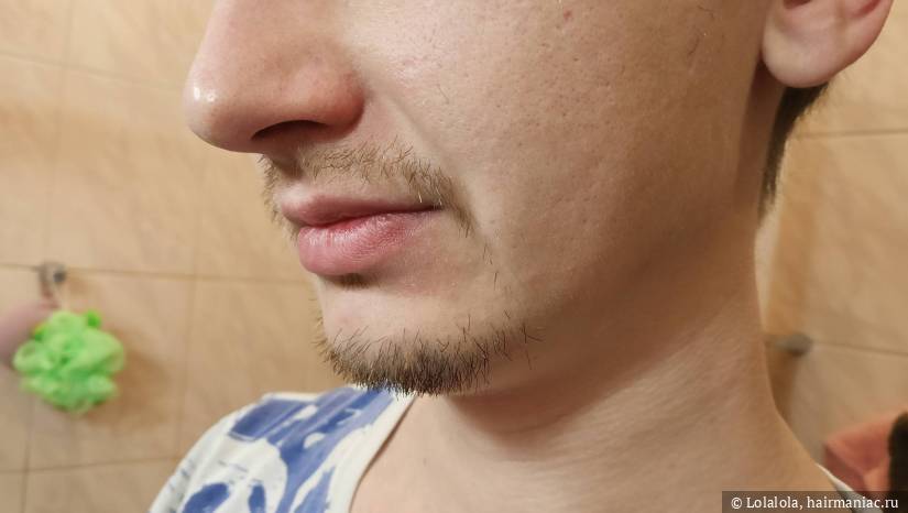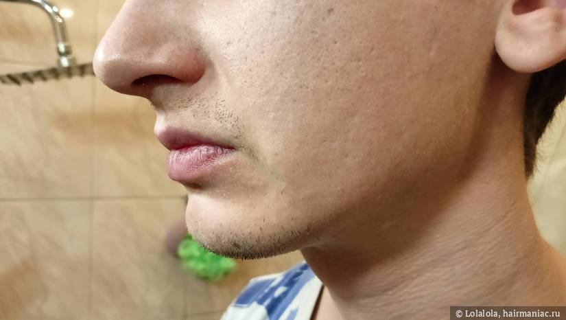Бритьё прошло уже не так гладко (каламбур то какой!). Во-первых, в силу технологии (несколько устаревшей) данной головки (лезвия находятся сразу же под сеточкой) помимо бритья происходит еще и своеобразный "пилинг" кожи лица, раздражение пришло сразу же (в сравнении с другой машинкой, которая также рассчитана на сухое бритьё). Во-вторых, волоски длиннее трёх миллиметров уже не сбриваются, хорошо видно на фото результата ниже.