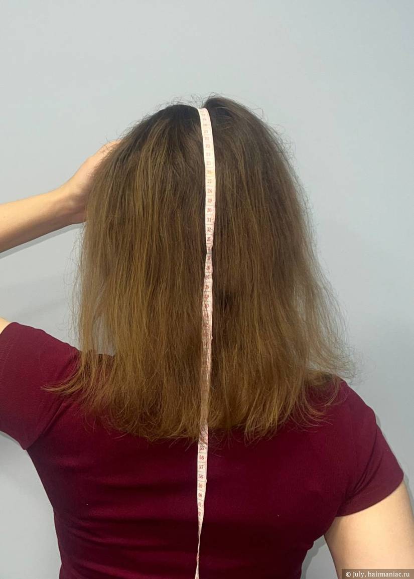 Когда я взяла точку отсчета год назад, объём хвоста, сразу, где должна быть резинка, был 5 см. Затем как-то дорос до 5.7, но после наращивания стал снова 4-5 см. На данный месяц ровно 5 см, но ниже там вообще еле-еле 2-3 см (очень хочется состричь). Я стригла в 2025 году два раза на 4-5 см, но до наращивания.