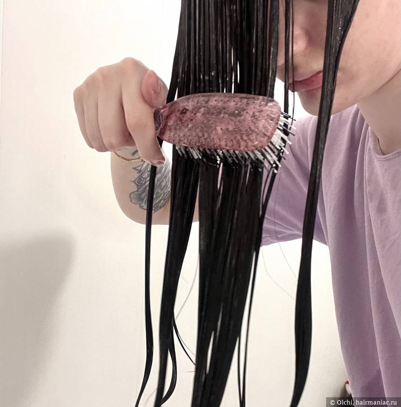 Производитель рекомендует прочесать маску для обволакивания каждого волоска, поэтому либо берём самую бережную расческу для мокрых волос (у меня это Русалочка от I love my hair), либо прочесываем пятерней. Обязательно начинаем с кончиков и не торопимся в этом деле.