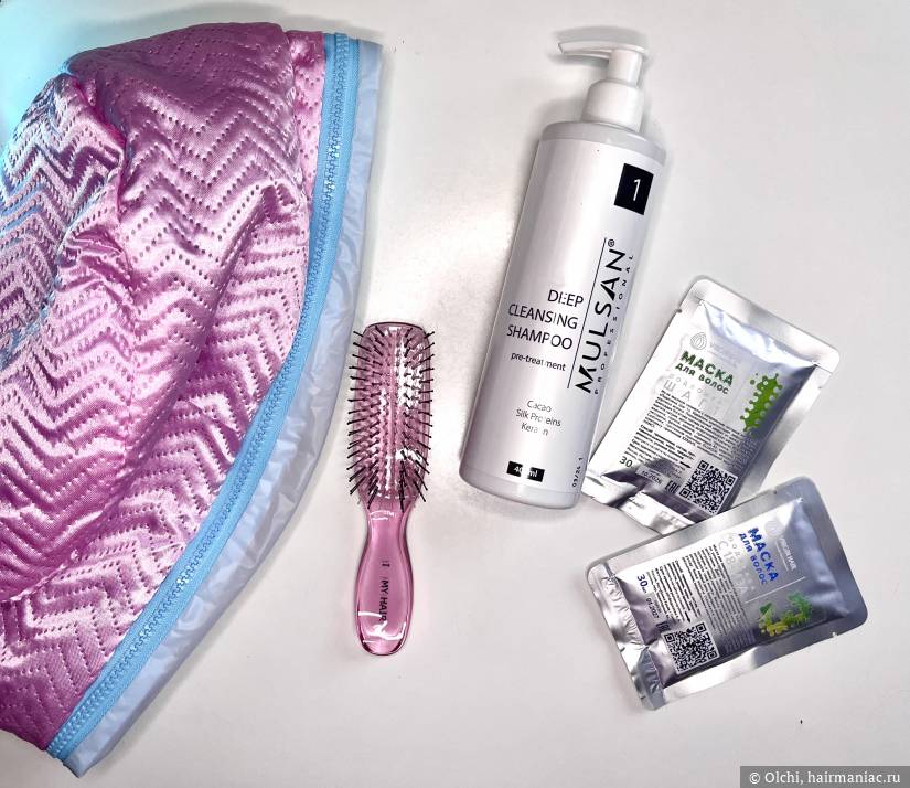 После распределения маски заботливо промываем расчесочку, закрываем саше и идем выдерживать состав 20 минут с термошапкой. Я лично увеличиваю время до 25 минут, поскольку моя самая бюджетная термошапка прогревается не за одно мгновение, а включать для прогрева заранее без какого-либо присмотра не рискую.