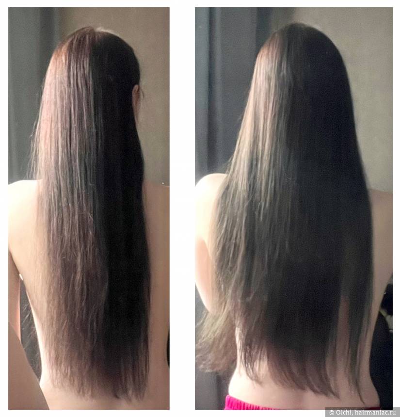 Даже несмотря на качество снимков, заметно невооруженным глазом, что поврежденные волосы стали более эластичными и шелковистыми, улучшилась текстура. Кончики хоть и сопельки (к слову, чуть позже я их состригла), но уже не такие безжизненные и чуть подвиваются, так как хорошо увлажнены. Закрывать кондиционером не потребовалось.
