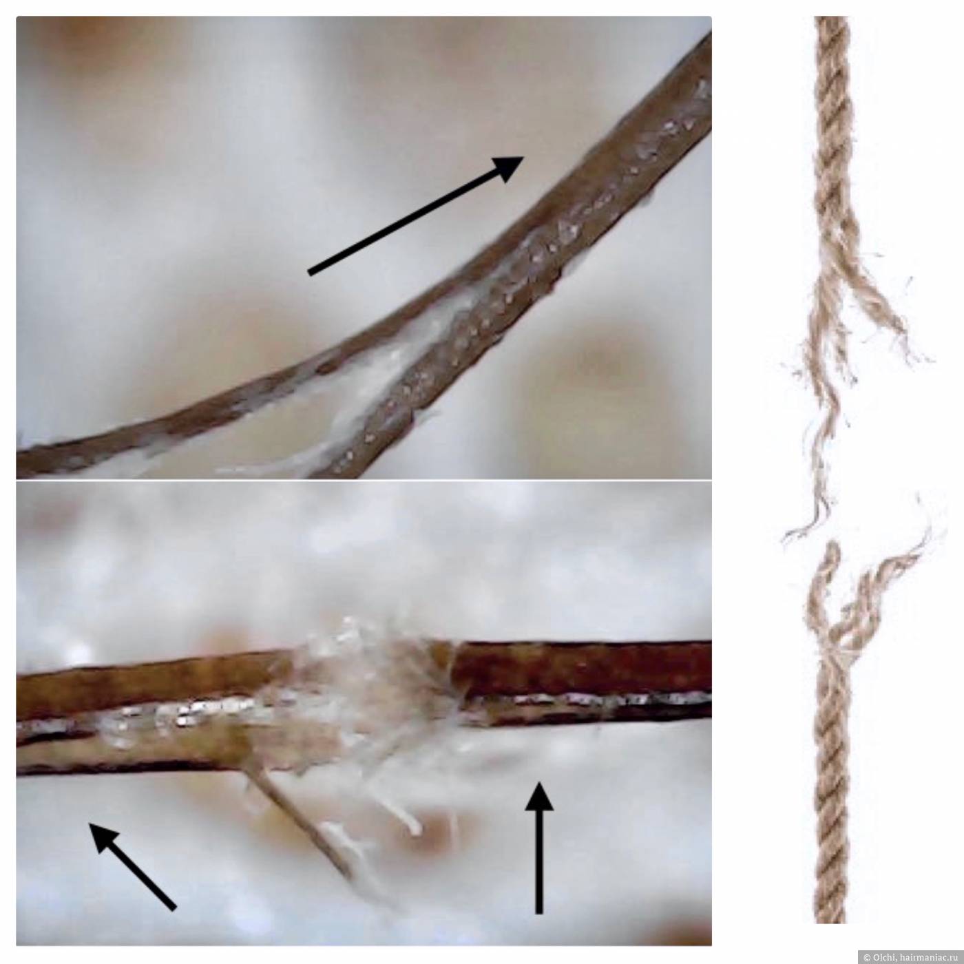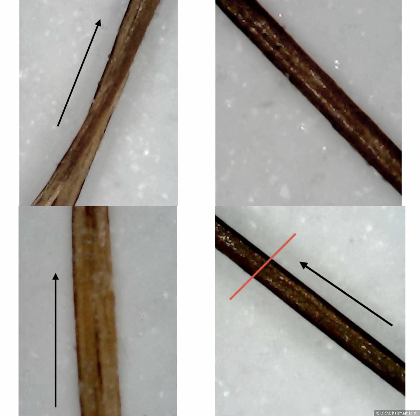 Сеченый волос — это не просто раздвоенный кончик. Это трещина, которая уходит вглубь кутикулы и кортекса. Чтобы убедиться в этом, достаточно взглянуть на волосы под микроскопом.