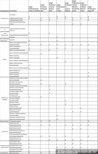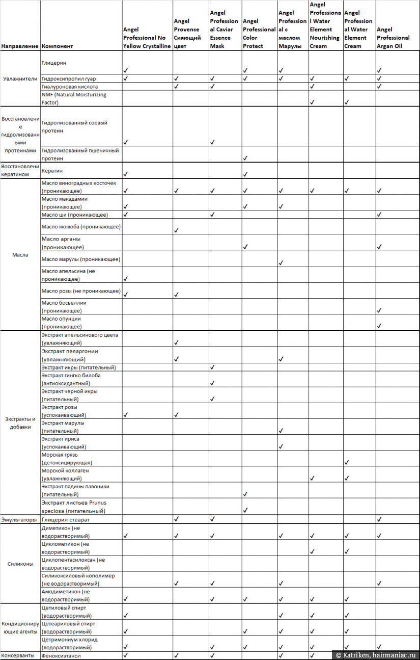 - Маска для окрашенных волос Angel Professional Color Protect Hair Mask: масло виноградной косточки, аргановое масло, гидролизованный протеин пшеницы, кератин — комплекс для восстановления волос. Амодиметикон — силикон. Оценка: Хорошая маска для уплотнения, но мои волосы плохо кондиционирует, делает слегка жестковатыми (но не сушит концы как Insight Damaged), эффект "много волос".
