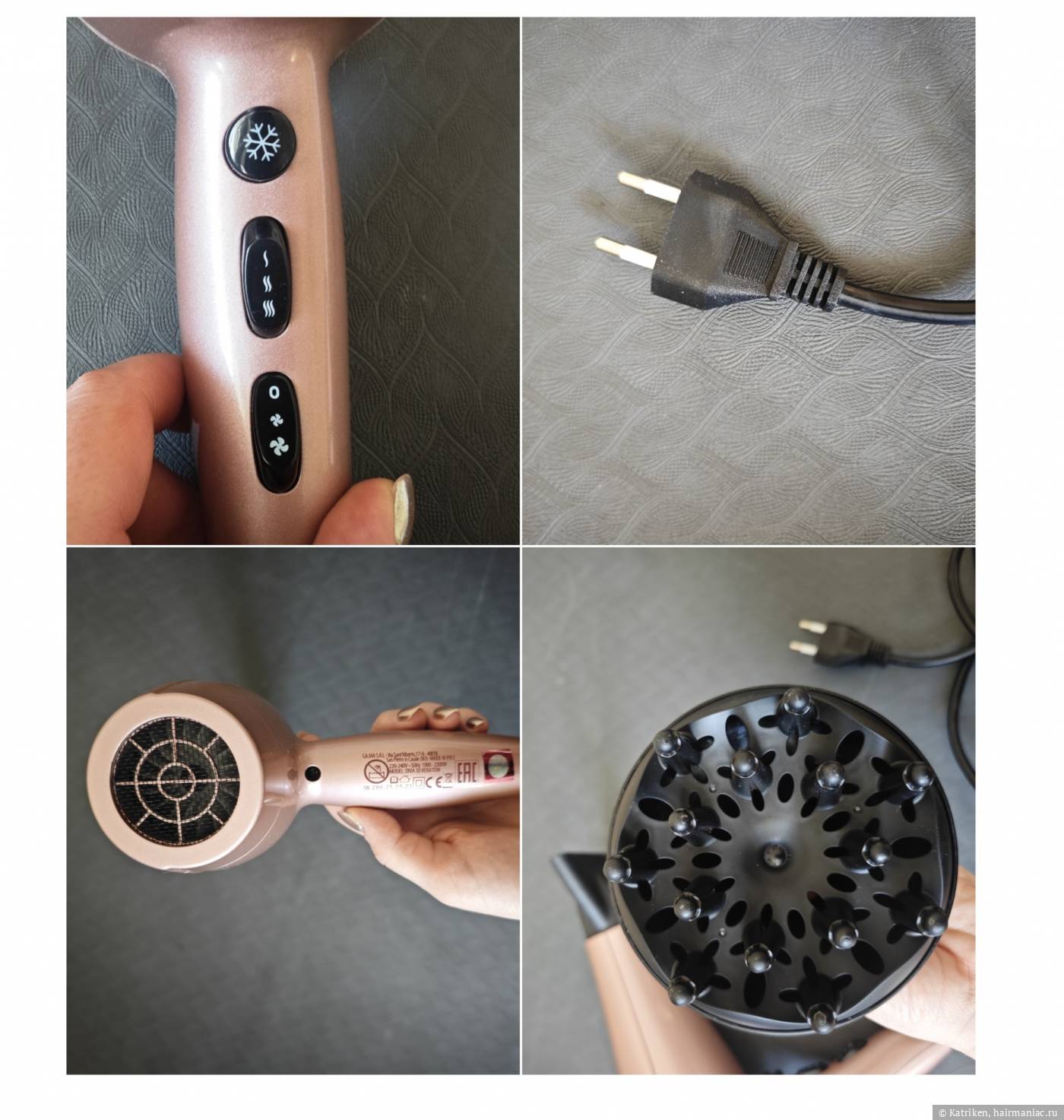 Когда мне прислали на обзор фен GA.MA Keration Diva 3D, я была немного разочарована. У меня уже есть любимый фен — Super Hair Dayer: лёгкий, стильный, удобный. А тут… дизайн будто из прошлого века: дешёвые на вид кнопки, старомодная вилка, которая выскальзывает из розетки при активном использовании. Насадка оказалась настолько тугой, что я едва смогла её надеть — не то что у моего фена с магнитными насадками!