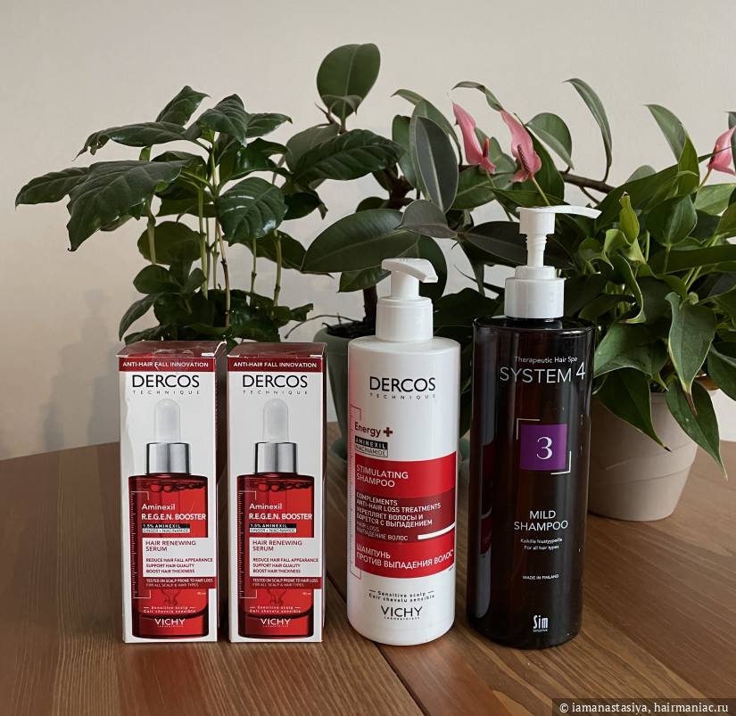 В этой категории у меня сейчас присутствует четыре баночки – два шампуня и две сыворотки против выпадения.