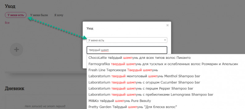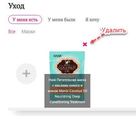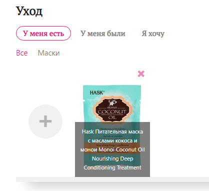 Система автоматически формирует списки по категориям косметических средств. И вы можете увидеть, что средства рассортированы не только по спискам "У меня есть", "У меня были", "Я хочу". Но и по назначению - шампунь, бальзам, маска и т.д. В каталоге на этапе оформления страниц есть графа принадлежности косметического средства. И если на моменте оформления средство отнесено к тритментам (интенсивная маска), то и здесь оно появится в этом качестве.