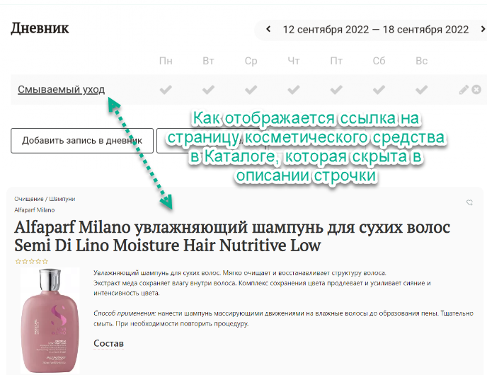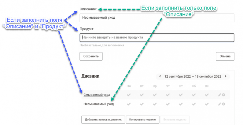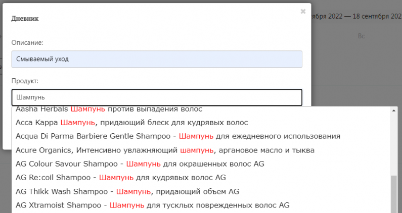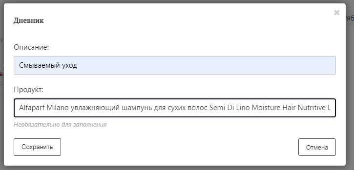 Если нужно сделать прямую ссылку на средство из Каталога, чтобы сохранить более точную информацию о косметическом средстве, то переходим к заполнению строчки "Продукт." Здесь ситуация аналогичная, как и в разделе "Уход": начинаем вводить название косметического средства, которое напрямую берет информацию из Каталога. Если средство есть, то находим его по наименованию. Если средства нет, то сначала нужно его добавить в Каталог, а потом уже к себе в профиль. Когда строчка заполнена - сохраняем результат.