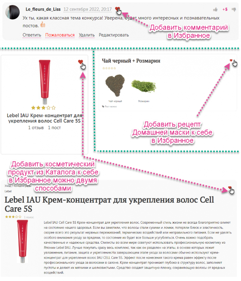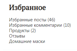 Ниже находится пункт Избранное, в котором отображается весь тот контент, что вы сохранили для себя. Чтобы сохранить пост, продукт, домашнюю маску или комментарий в Избранное, нужно нажать на сердечко. Как это отображается видно на примере поста Алёны Masia и комментария Татьяны Le_fleurs_de_Liss.