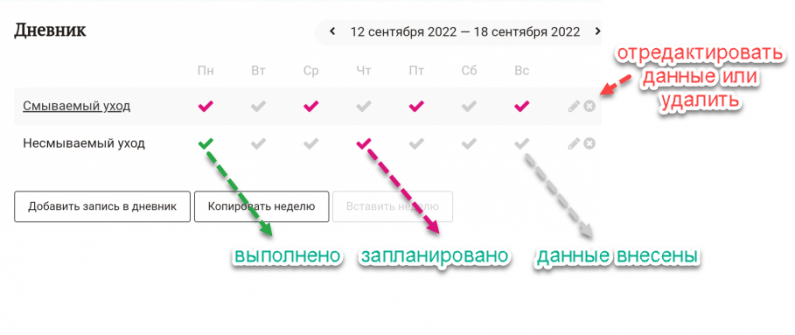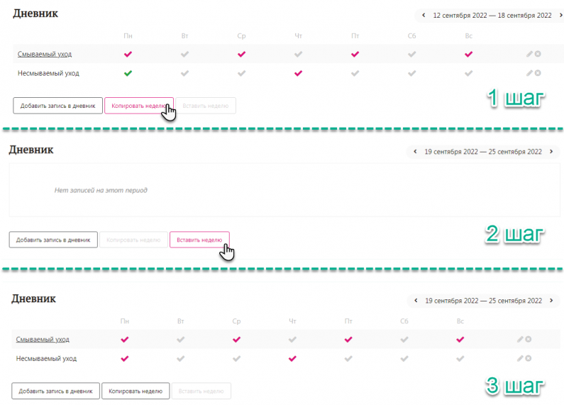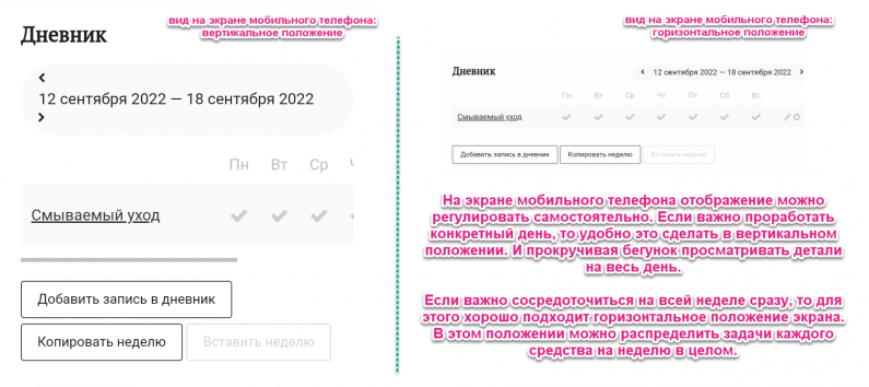 Если вы хотите вести ежедневник ухода за волосами и отмечать какие процедуры для волос в какой день вы делаете, то заполняйте блок "Дневник" ниже. Его можно комфортно заполнять не только с персонального компьютера, но и с мобильного телефона. Это удобно и практично. В том числе и потому что больше нет необходимости заново набирать новую неделю, если на прошлой было тоже самое (или нужно лишь немного откорректировать) - одним кликом на кнопку "Копировать неделю" можно скопировать данные всей недели.