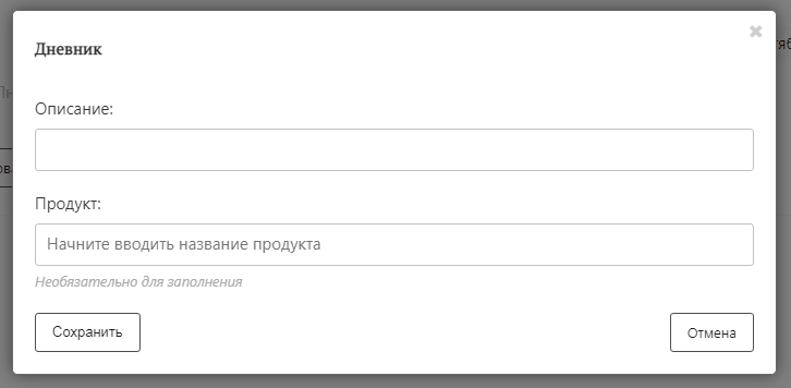 Нажмите на кнопку "Добавить запись в дневник", чтобы начать заполнение. "Описание" - это то, что будет видно при сохранении данных. Поле для удобства пользователей имеет свободную форму заполнения. Можно написать как общую фразу, так и частное определение.