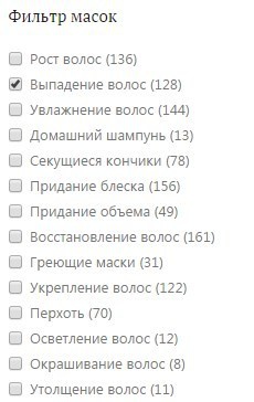 Под картинками компонентов маски находятся теги, которые обозначают эффект каждой домашней маски. Например, мне нужны рецепты масок от выпадения волос. Я кликаю на «Выпадение волос» в правом меню «Эффекты» и поиск выдает мне все подходящие варианты.