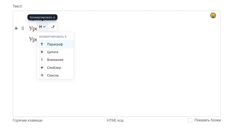 В новой версии редактора подзаголовки формируются иначе. На поле редактора нужно нажать плюс, затем выбрать из списка "Заголовок". Если Вы в какой-то момент решите, что заголовок не нужен, то можно выделить его и появится меню конвертирования, где можно из списка выбрать пункт, который конвертирует выделенный текст. В новом редакторе есть те же уровни заголовков, но при этом Вы можете работать с этой функцией более широко.