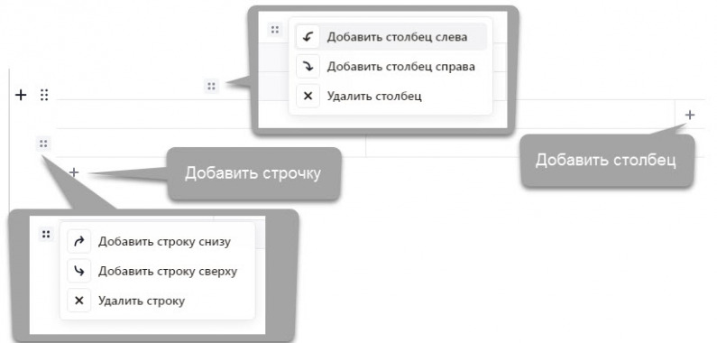 Добавить > Таблица. И далее помимо 6 точек с Настройками есть еще кнопки для работы со столбцами и строчками: