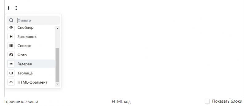 Галерея теперь представляет собой отдельную функцию. Больше нет необходимости искать и добавлять специальный тег, как это было реализовано в старом редакторе.