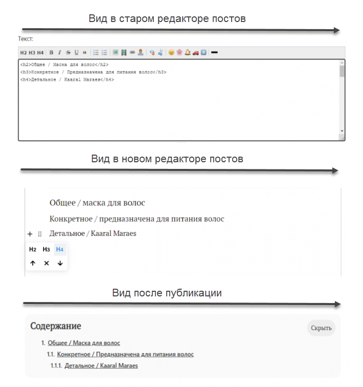 В чем разница выстраивания заголовков между редакторами при общем равном результате после публикации: