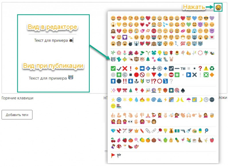 Смайлики доступны к выбору на поле редактора в правом верхнем углу. Акцентируем Ваше внимание на том, что смайлики и эмоджи не заменяют знаков препинания. И перед смайликом нужен знак препинания, который соответствует контексту.