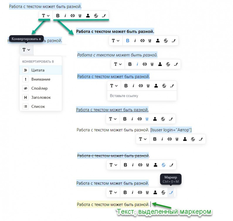 При работе с текстом есть ряд возможностей. Выделив текст можно конвертировать его в другую функцию: Цитата, Внимание, Спойлер, Заголовок, Список. Либо добавить цитату, либо выделить маркером участок текста, к которому нужно вернуться позже. И доступны стандартные функции - выделить полужирным, курсивом, подчеркнутым,
