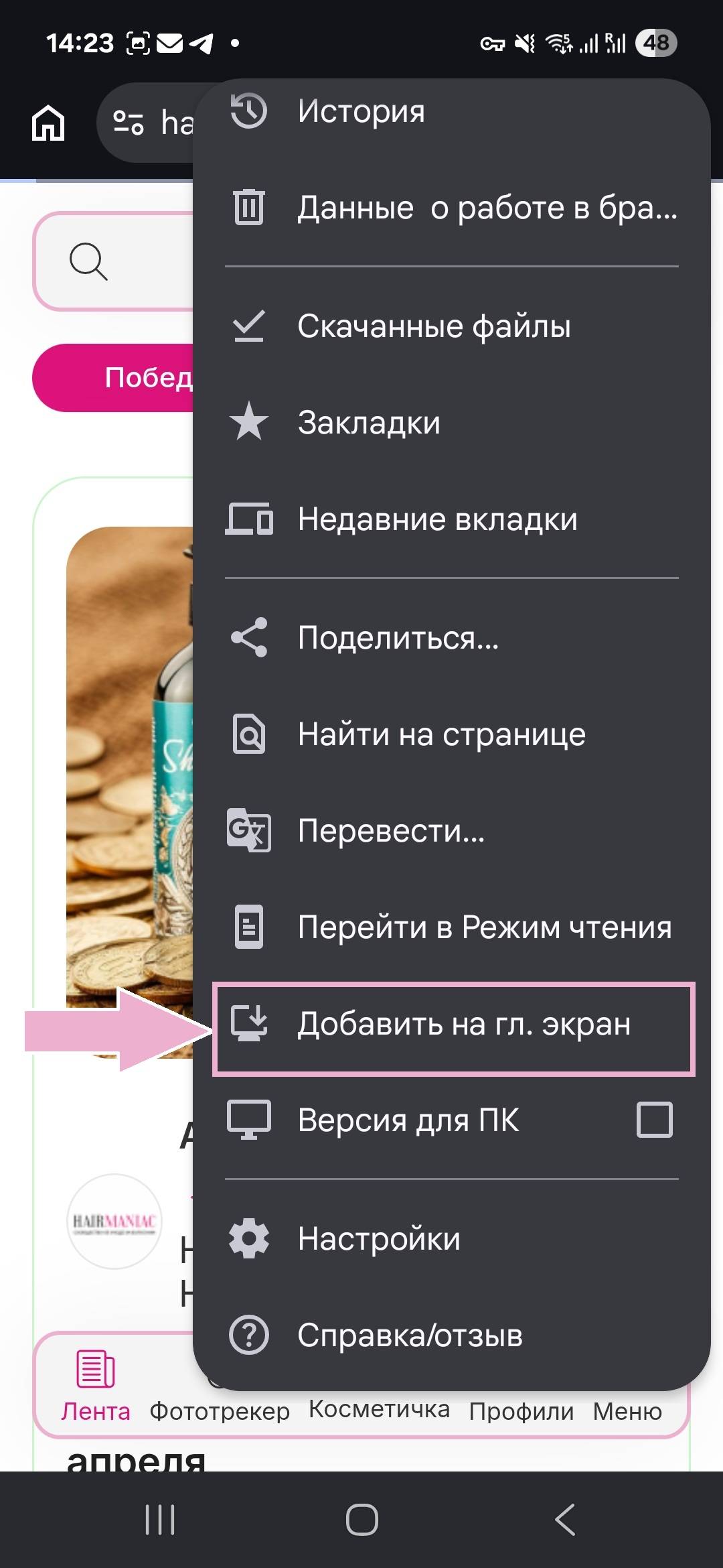Затем выбрать пункт «Установить приложение» (или «Добавить на гл. экран»)