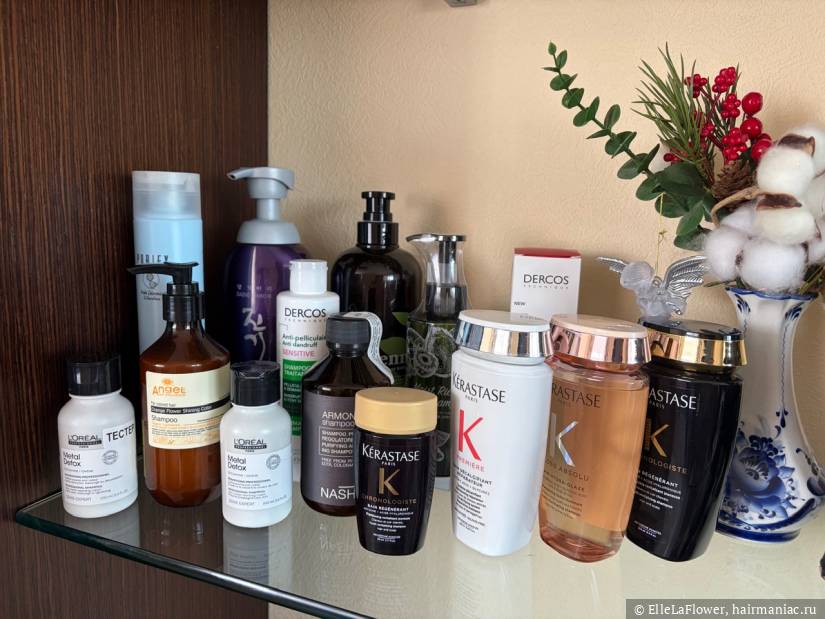 Тут вся моя домашняя коллекция. Сейчас в ванной у меня стоят четыре основных шампуня:
