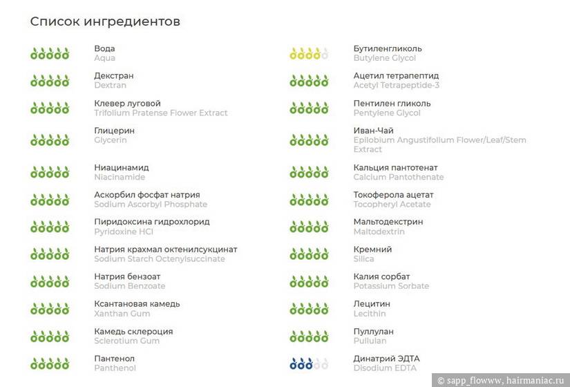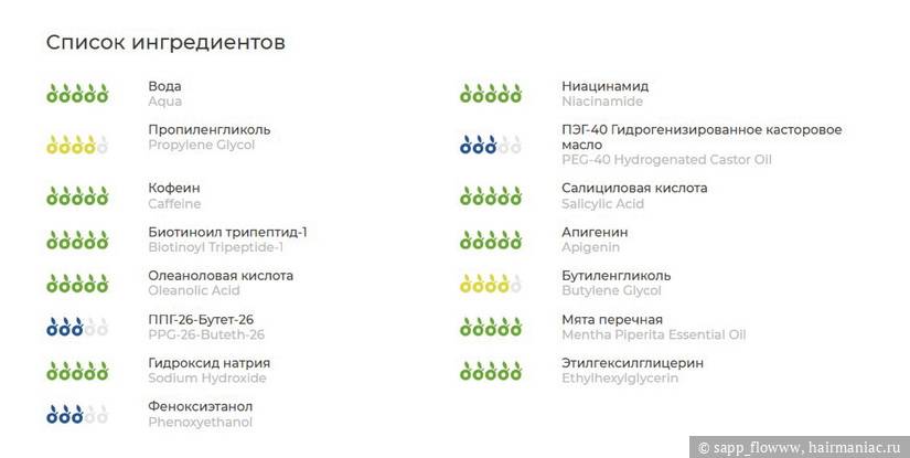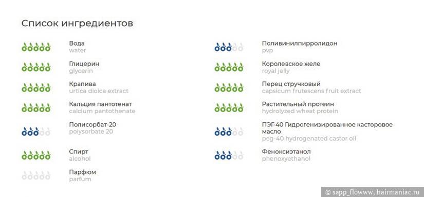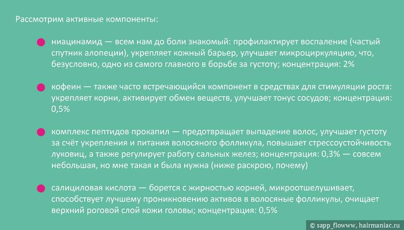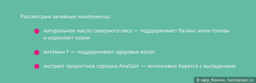 Состав богатый и рабочий. По сути, он призван создать благоприятную среду для роста здоровых волос, приводя в баланс состояние кожи головы и обеспечивая фолликулы «строительным материалом».