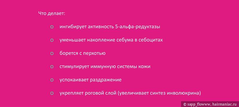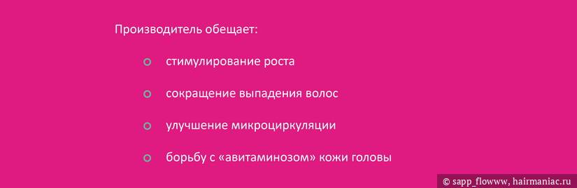 Для каких волос: для ослабленных и чрезмерно выпадающих, для истончённых; также может использоваться при себорее и зуде кожи головы; возможно применение в целях профилактики.