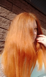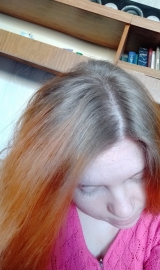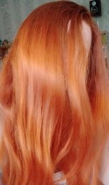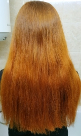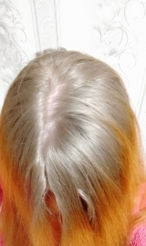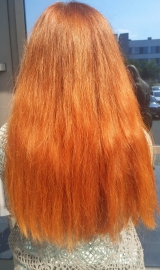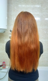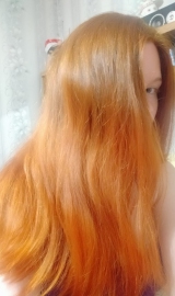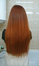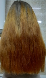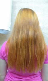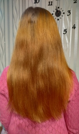 Тип волос: среднепористые, тонкие, густые, немного волнистые. Половина волос окрашена краской, сверху хна.