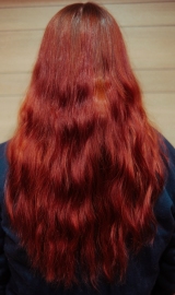 Мои волосы: многократно окрашенные тониками и массмаркет-й краской ( в тёмно-бордово-красный), тонкие, средней густоты и пористости, в естественном виде имеют лёгкую волну. Основная длина повреждена обесцвечением, кератином и прикорневым объемом двухгодичной давности