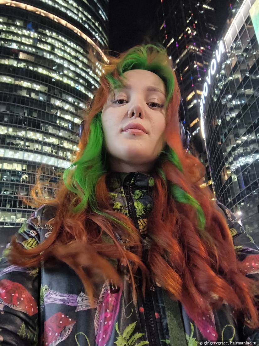 Вот собссно мой зелёный)) Но блин, он быстро вымывается, приходится тонировать чуть ли не каждую неделю… А ещё, теперь стало геморно покрасить корни основной части волос, поэтому я крашу только чёлку( осветляю на порошке корни, потом в зелёный IroIro). Потому что мне банально лень вот это всё разделять, а в салон или к мастеру на дом — тем более лень идти. Как-то так( Зато, можно определять, как у меня что отрастает по чёлке))