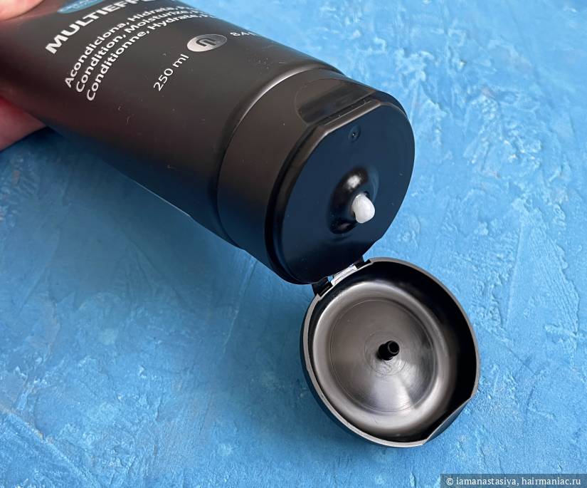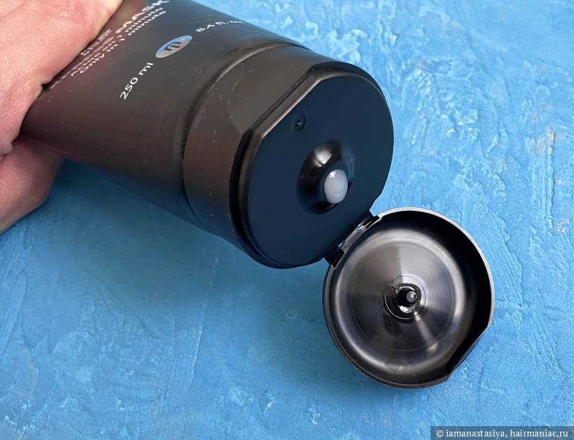 Маска находится в тубе из черного плотного пластика, точно такой же, как и предыдущий кондиционер. Текстура у этой маски легкая, гелевая. Из-за этого расход великоват. Она отлично распределяется по волосам, полностью впитываясь. Запах у маски неяркий, похож на одеколонистый аромат многофункционального кондиционера.