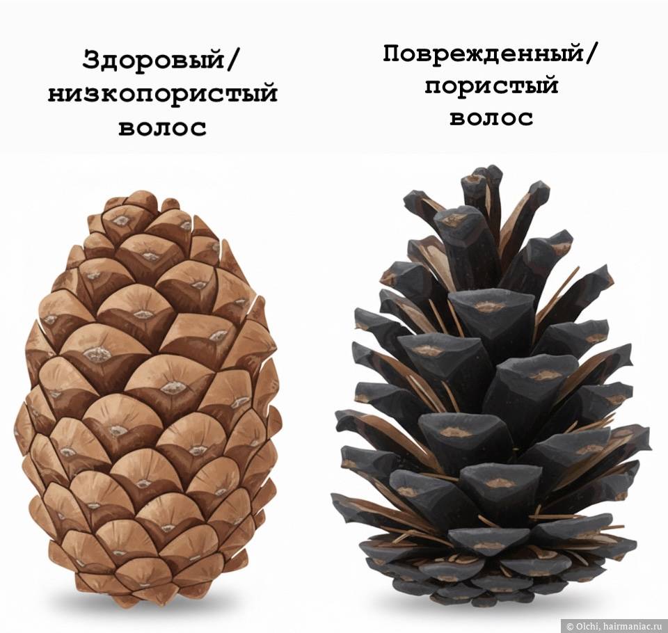 Пористый и/или поврежденный волос (после окрашивания, осветления, горячих укладок или ультрафиолета) напоминает раскрытую шишку: чешуйки приподняты, деформированы, а местами и вовсе отсутствуют. Структура становится похожа на губку, влага стремительно улетучивается, не задерживаясь внутри.