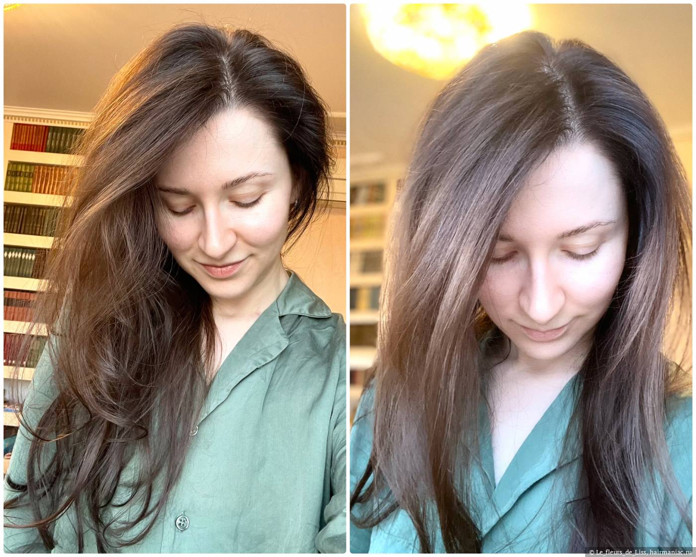 - если много нанести из-за сильного блеска может дать эффект несвежих волос (это в случае нанесения на сухие волосы, при нанесении на влажные и хорошем прослушивании горячим воздухом такого эффекта не наблюдается)
