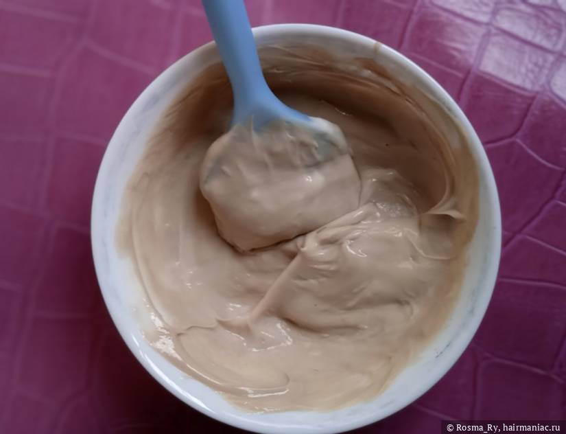 В общей сложности получилась целая миска смеси! Консистенция - густого, плотного крема. Запах специфический, аммиачный, характерный, но не "убийственный, слезовыносящий", вполне терпимый.