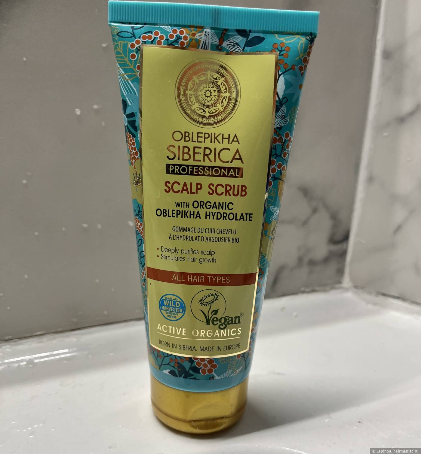 - Скраб облепиховый от Natura Siberica. Наношу по проборам на влажные корни, взмыливаю, массирую подушечками пальцем минутку, оставляю на 3 минуты. Потом смываю. Смывается на отлично за 2 намыливания. Корни промывает до скрипа. Добавляет корням объема. Волосы на 1 день дольше остаются чистыми.
