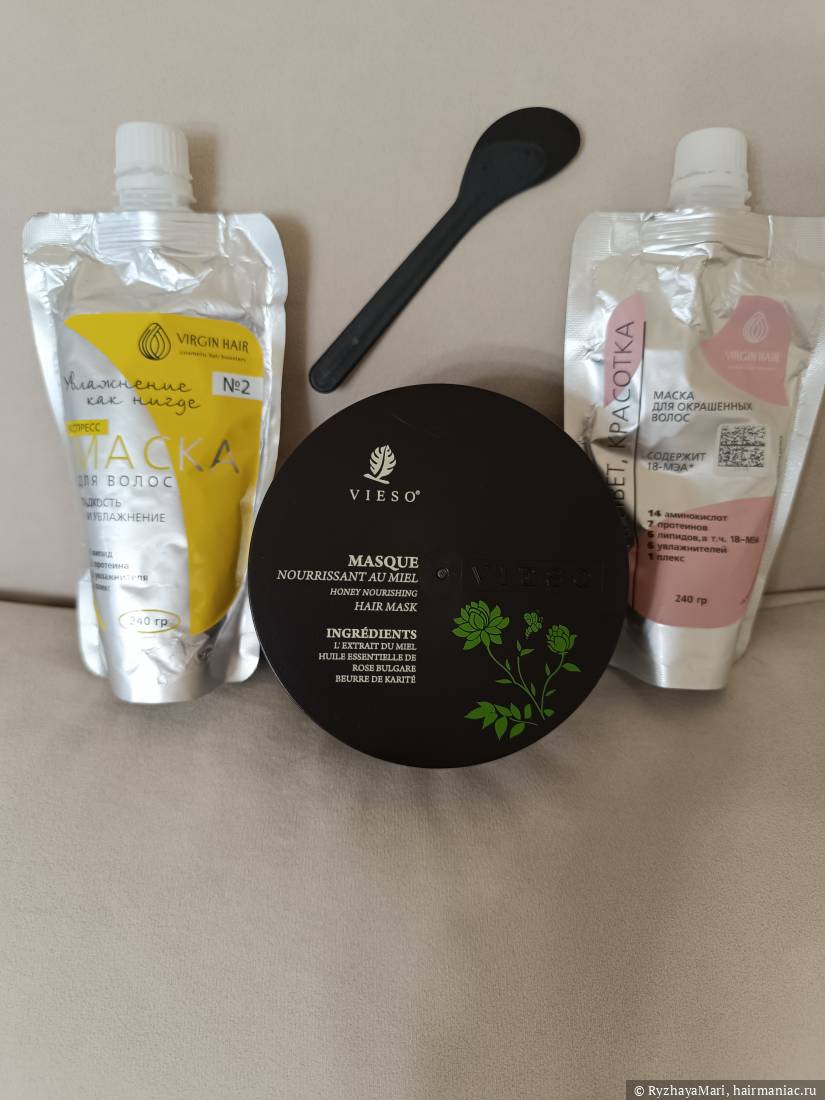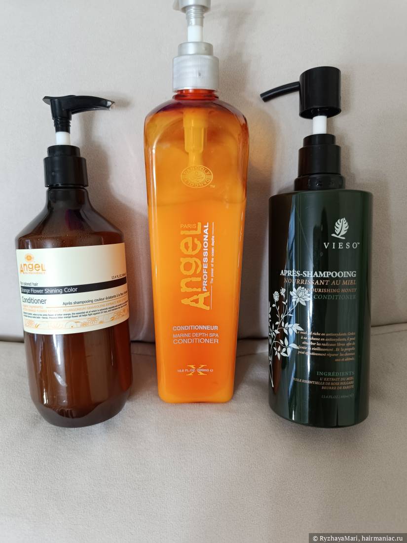 Конечно, медовый Vieso - по отзывам, он должен нереально смягчать, плюс, так как я побаиваюсь переходить на совсем уж бессиликоновый уход, Angel provence с цветком апельсина, и Angel professional Marine depth spa. Апельсиновый люблю, обычно использую в первые дни после окрашивания, он довольно деликатный, по моим ощущениям, цвет с ним вымывается не так быстро.