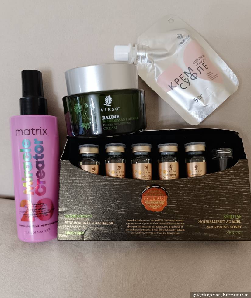 Vieso несмываемый крем с мёдом, его буду наносить на влажные чистые волосы. Много читала о нём восторженных отзывов, очень хочется попробовать!